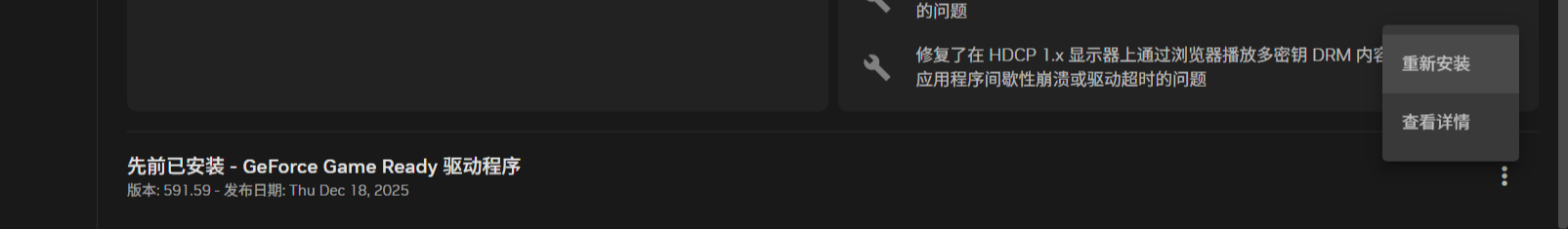 · 打开NVIDIA App -【驱动程序】,找到旧版本驱动程序,选择重新安装。